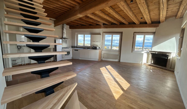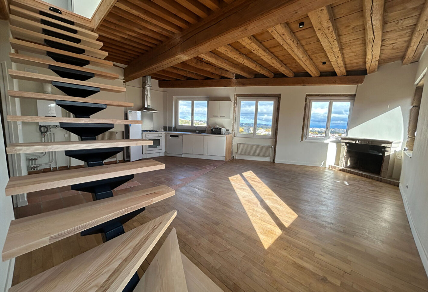AU PIED DES PENTES DE LA CROIX-ROUSSE, ET DU MÉTRO C (Arrêt "Croix Paquet"), ET A 6 MIN A PIED DU BUS 9 et C5 (Arrêt "Hôtel de Ville L. Pradel"), niché au 5ème et dernier étage SANS ascenseur, découvrez cet magnifique Duplex de 95.52m² (124m² au sol) entièrement RÉNOVÉ, il se compose au Rez-de-chaussée, d'une Entrée avec placards de rangement, d'un très grand Séjour avec Cuisine ouverte, aménagée et équipée (plaque de cuisson, hotte, four, réfrigérateur, lave-vaisselle, micro-onde) avec vue exceptionnelle sur la ville de Lyon et panoramique sur les Alpes, de 2 Chambres, une Salle de bains, une Salle d'eau et un WC indépendant. A l'étage, découvrez 2 Chambres supplémentaires, une Salle d'eau et un WC indépendant.