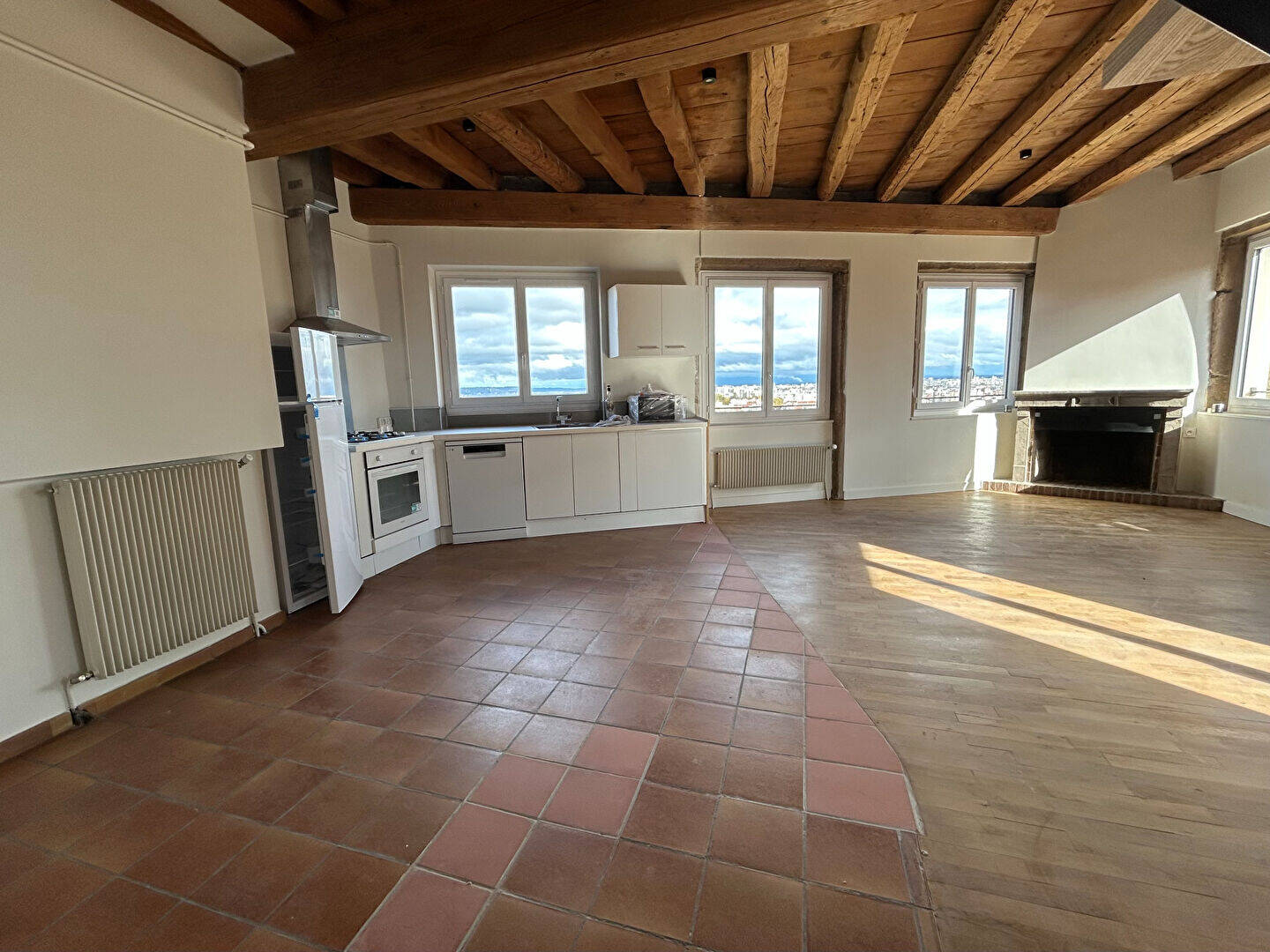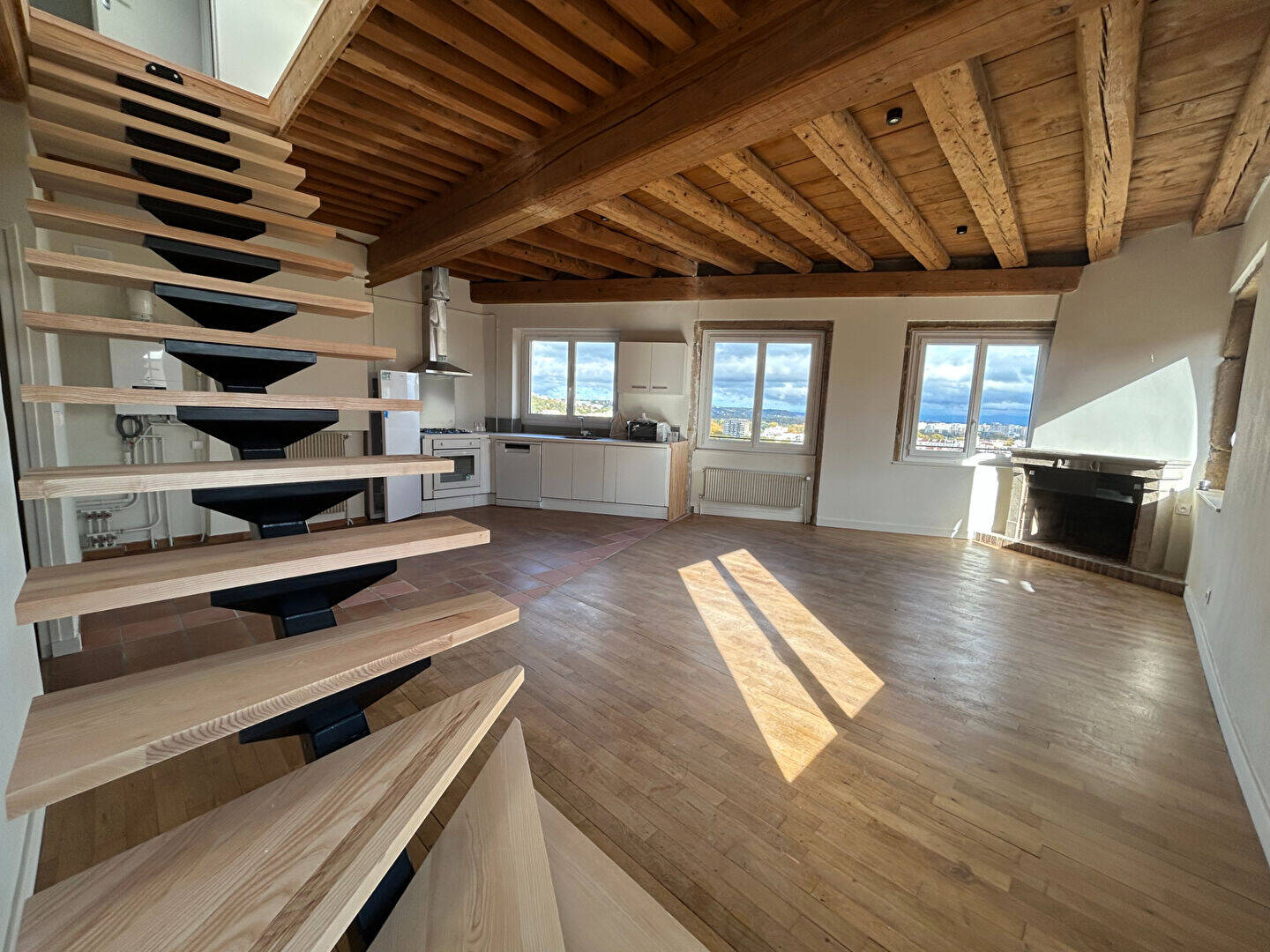 AU PIED DES PENTES DE LA CROIX-ROUSSE, ET DU MÉTRO C (Arrêt "Croix Paquet"), ET A 6 MIN A PIED DU BUS 9 et C5 (Arrêt "Hôtel de Ville L. Pradel"), niché au 5ème et dernier étage SANS ascenseur, découvrez cet magnifique Duplex de 95.52m² (124m² au sol) entièrement RÉNOVÉ, il se compose au Rez-de-chaussée, d'une Entrée avec placards de rangement, d'un très grand Séjour avec Cuisine ouverte, aménagée et équipée (plaque de cuisson, hotte, four, réfrigérateur, lave-vaisselle, micro-onde) avec vue exceptionnelle sur la ville de Lyon et panoramique sur les Alpes, de 2 Chambres, une Salle de bains, une Salle d'eau et un WC indépendant. A l'étage, découvrez 2 Chambres supplémentaires, une Salle d'eau et un WC indépendant.